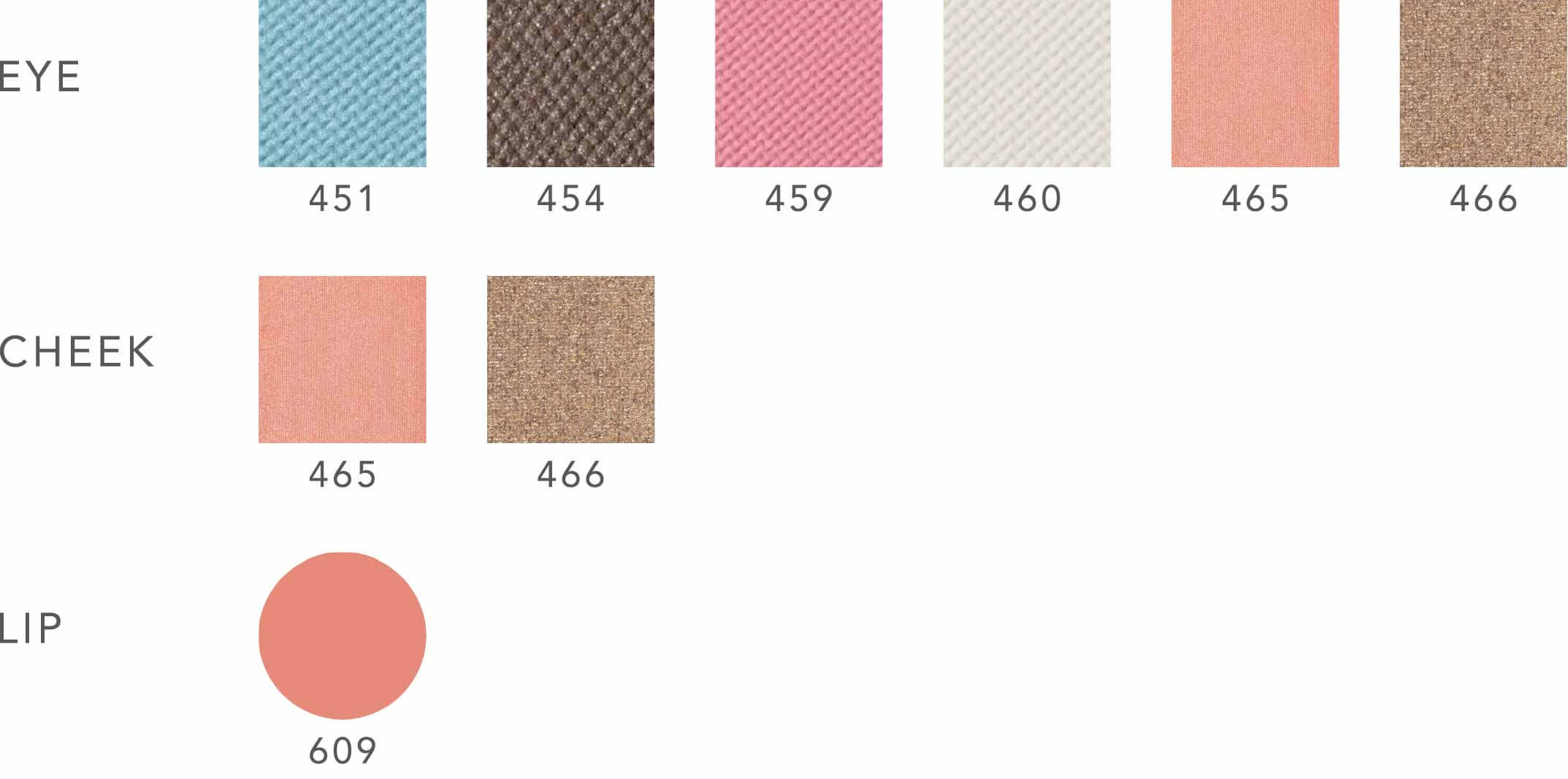 オレンジピンクベージュラメ(465)+オレンジゴールドラメ(466)で素肌そのものが色づいたようなナチュラルな骨格チークで、健康的な自然美を魅せます。